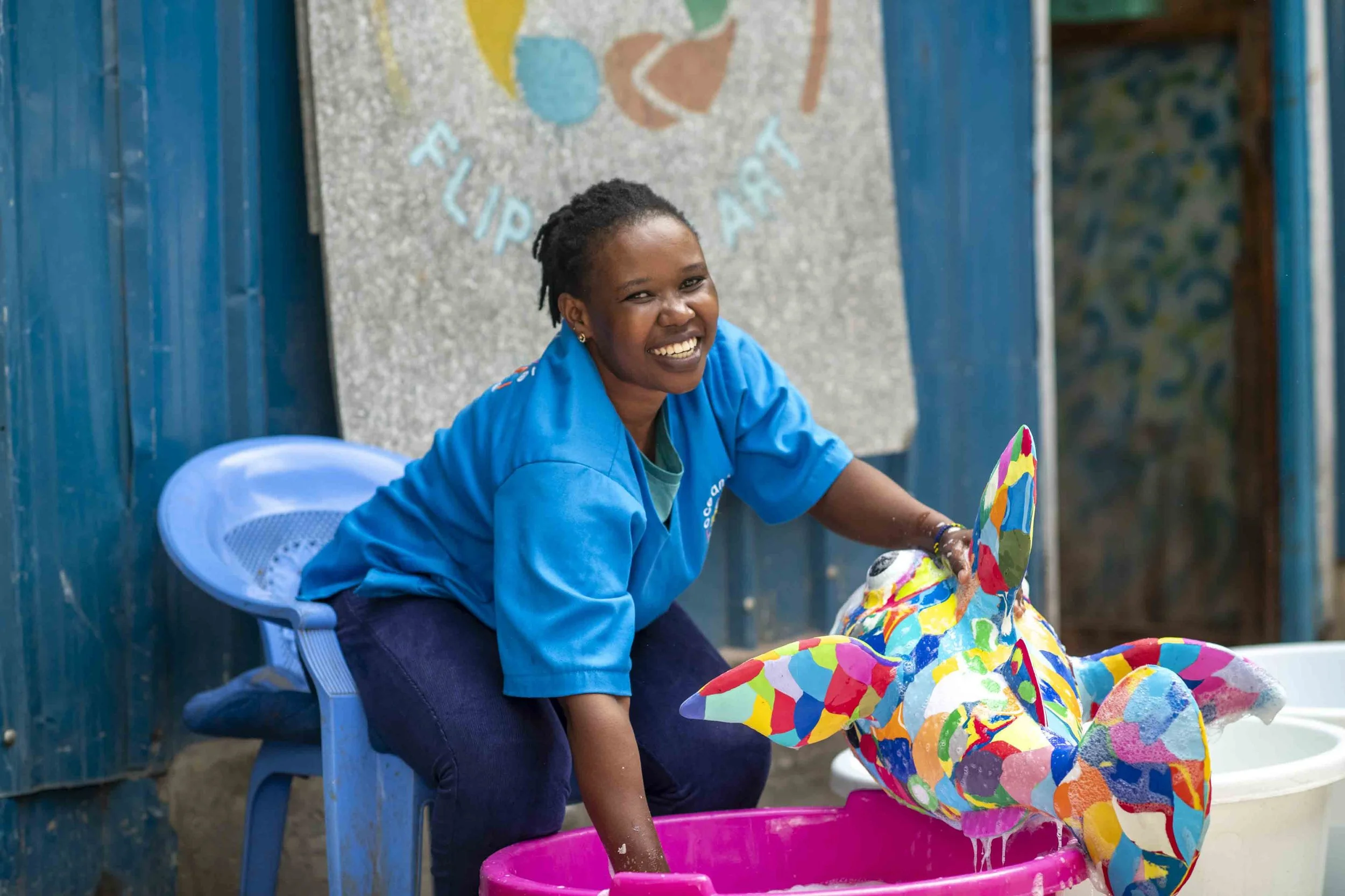 Elke dag hergebruiken ze afgedankte teenslippers van Keniaanse stranden en waterwegen, en transformeren ze tot levendige, met de hand gesneden sculpturen die de planeet schoonmaken en waardige werkgelegenheid creëren.
